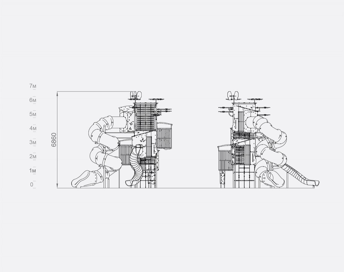 Представляет собой 3-этажный домик. Состоит из канатных сеток, металлических перекладин для лазания, малой скалодромной панели с зацепами и двух горок: открытой металлической с защитными бортиками и закрытой тоннельной.