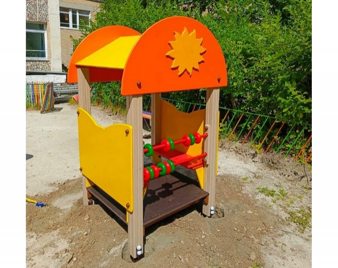 Несущие столбы должны быть выполнены из клееного бруса сечением 90х90 мм. Снизу столб должен заканчиваться металлическим подпятником сечением Ø 42 мм, который бетонируется в землю. Наверху домика двухскатная крыша и арки с обеих сторон, выполненные из фанеры 18 мм. Деревянные детали должны быть тщательно отшлифованы, загрунтованы и окрашены профессиональными двухкомпонентными красками в заводских условиях. Боковые стенки изготовлены из влагостойкой окрашенной фанеры толщиной 18 мм. Размер пола не менее 1000х1000 мм, из ламинированное фанеры толщиной 18 мм.