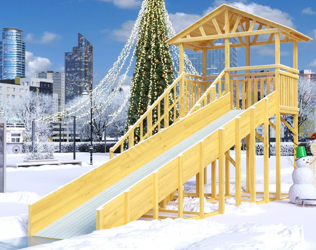 Зимняя горка создана для активных игр на свежем воздухе. Длинный и широкий скат позволяет кататься на больших тюбингах и ледянках, а родители могут быть спокойны за безопасность детей.