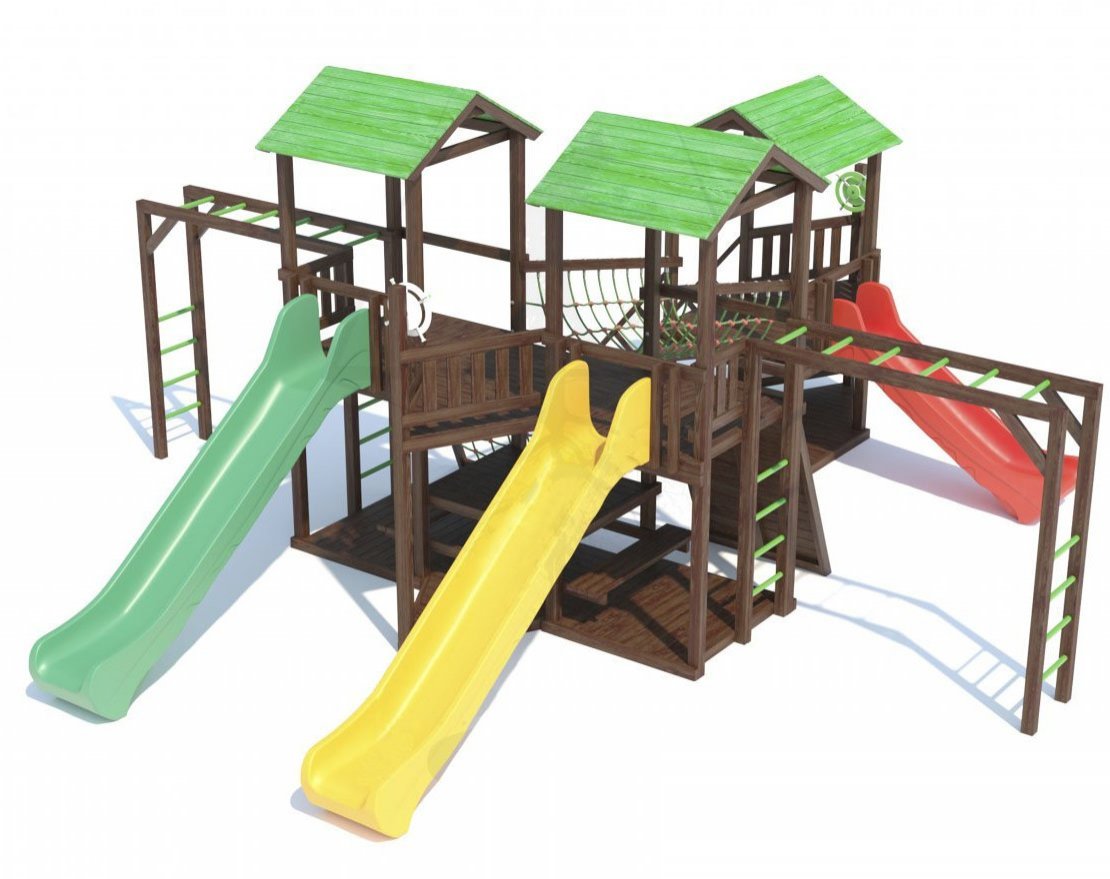 Основа детской игровой - спортивной конструкции – три башни с мостами и балконами «серия I». Конструкция оснащена тремя двухскатными деревянными крышами, встроенным полом, встроенным столиком с лавками в нижней части конструкции, тремя пластиковыми антивандальными скатами с превосходной скользящей поверхностью, двумя «П»-образными деревянными рукоходами, скалодромом, канатной лестницей с армированным канатом, деревянной лестницей, антивандальными пластиковыми игровыми панелями и антивандальными штурвалами. Для безопасности ребенка предусмотрены перила на лестнице, заборчики и ограждения над зонами препятствий (скат).