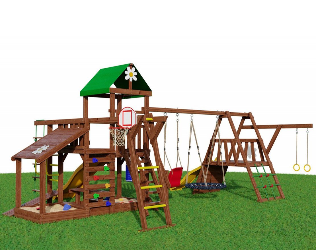 Изготовленная из карельской сосны площадка включает множество модулей, которые помогут стать детям сильными и здоровым.
