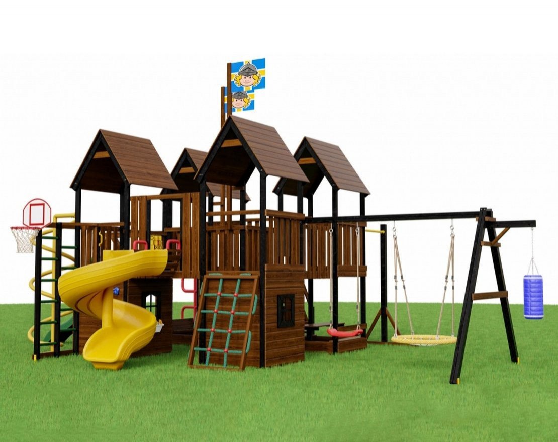 Яркие флажки задают сказочный настрой, а надёжная конструкция из тщательно обработанного дерева — спокойствие родителям. Детская площадка отлично подойдёт как для частного участка, так и для школы или детского центра — места хватит всем!