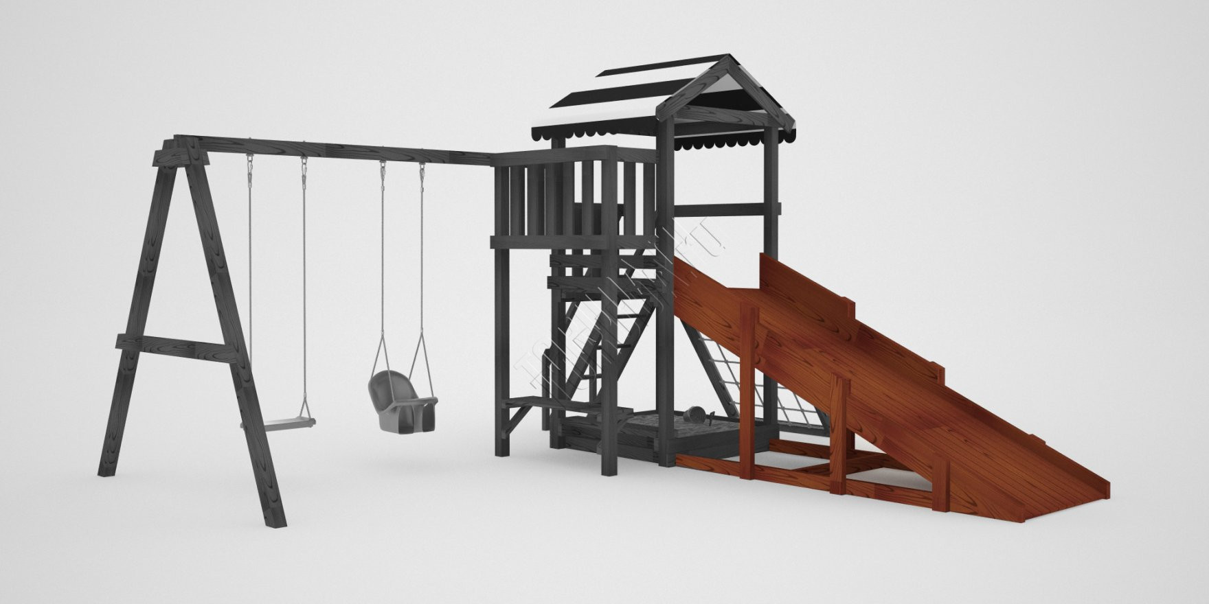 Сбоку к башне крепится качельная рама для двух элементов на выбор, например, качели «Лодочка» и «Люкс» со спинкой. Они очень нравятся как маленьким деткам, так и младшим школьникам.