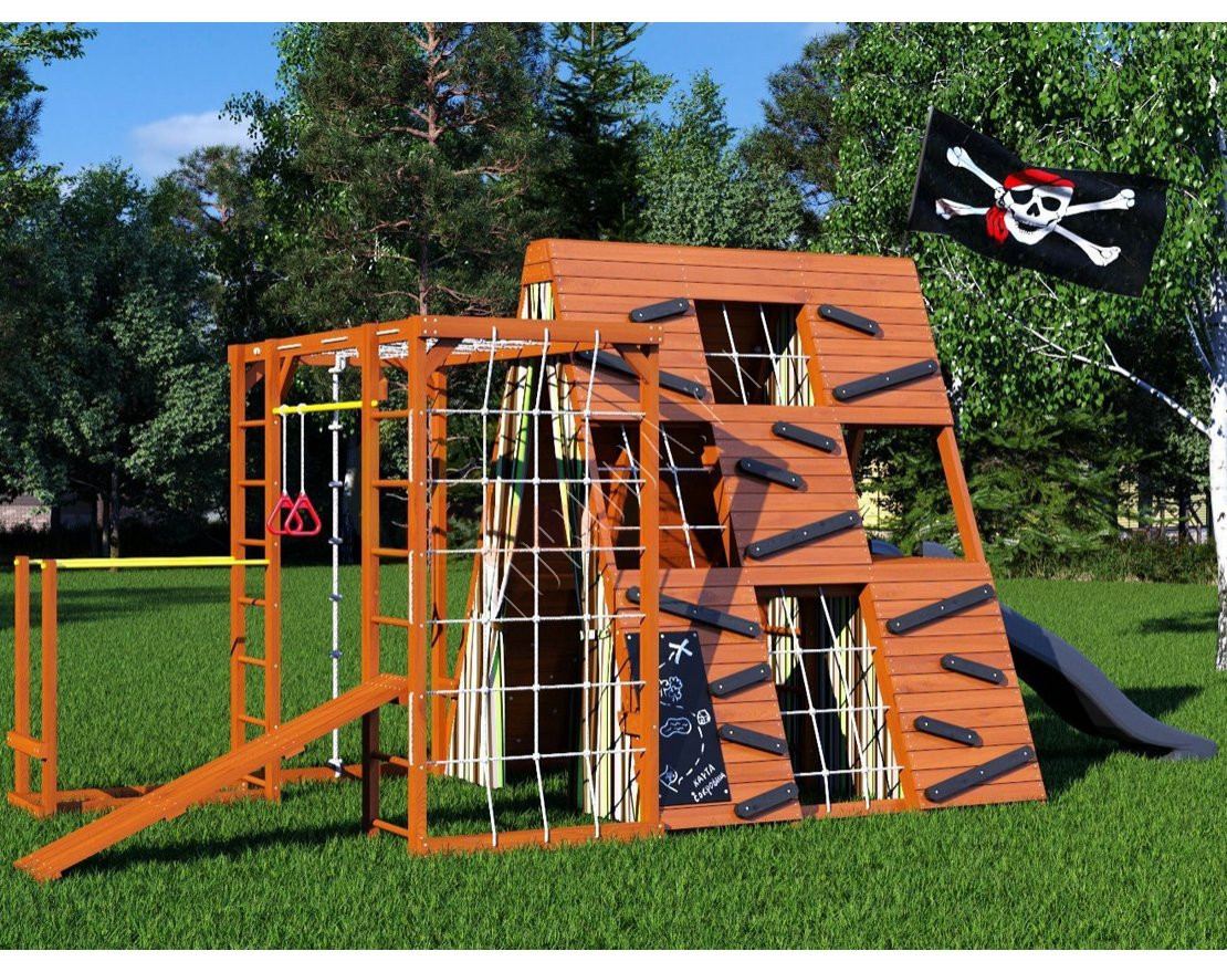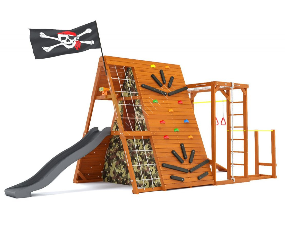 Тематический домик широкого назначения со спортивно-игровыми функциями, внутренняя игровая площадь которого составляет 3,6 кв. метра, а комплект распашных занавесов с подхватами придаст вашему домику уютный и защищённый вид.