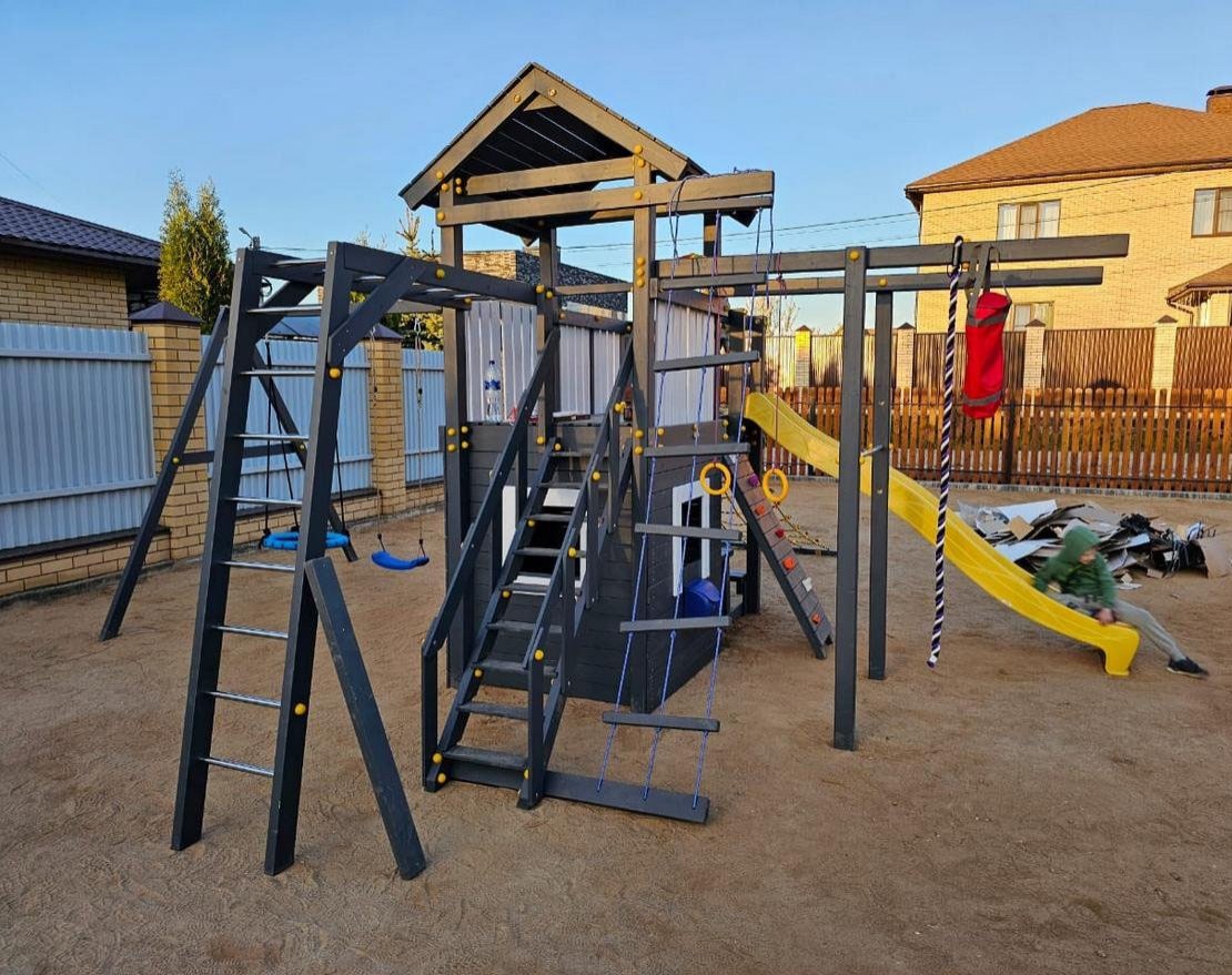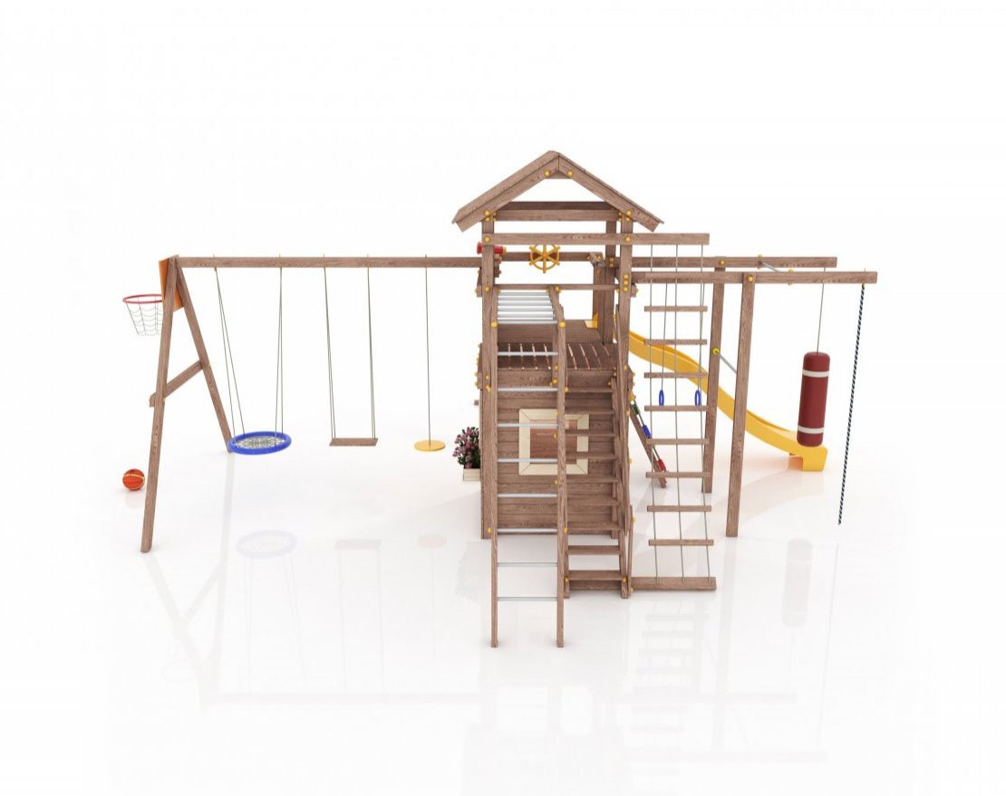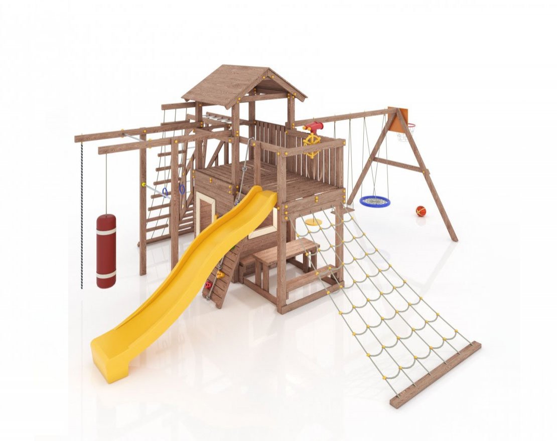 Максимально возможная комплектация в сочетании с турником, скамейками со столиком, домиком с окошками (теремок), в комплекте большая паутинка и пиратская лестница. Детская площадка в полной комплектации позволит вашим детям разнообразить свои игры на свежем воздухе, а так же пригласить своих друзей для веселого времяпрепровождения. Места хватит всем!