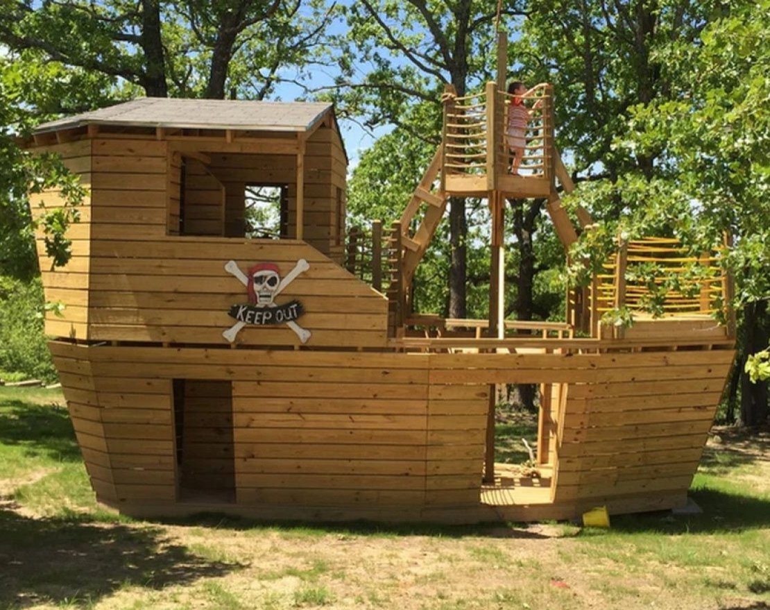 Воронье гнездо – это наблюдательный пост с 2 лесенками. Он соединяет нос и корму корабля. К мачте можно привязать флаг. На втором этаже установлены 2 люка для спуска и подъёма. Также есть обычная лестница, по которой можно безопасно подняться в верхнюю комнату. К корпусу комплекса крепится перекладина для подвесных качелей.