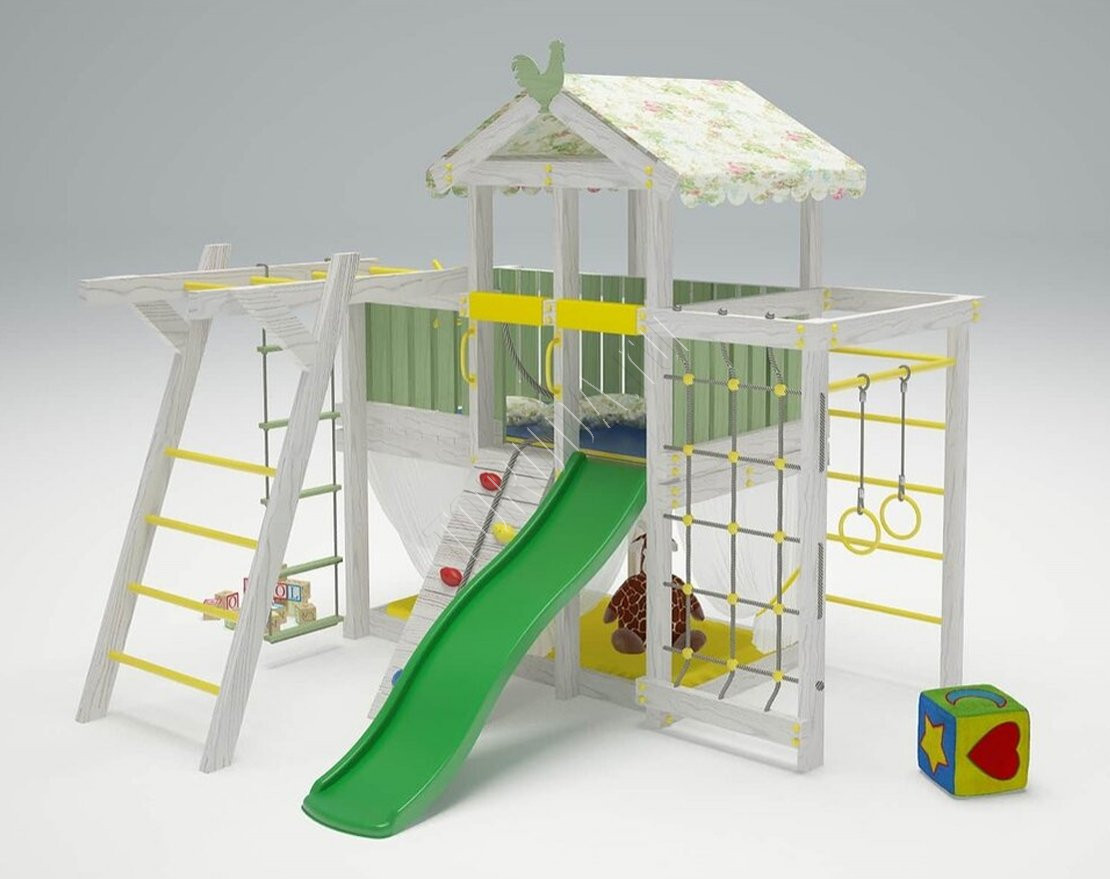 Двухъярусная площадка – разработана специально для большой семьи. Прочный каркас из массива хвойных пород выдержит нескольких детей.