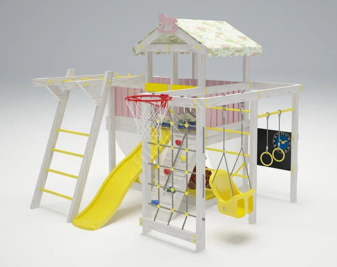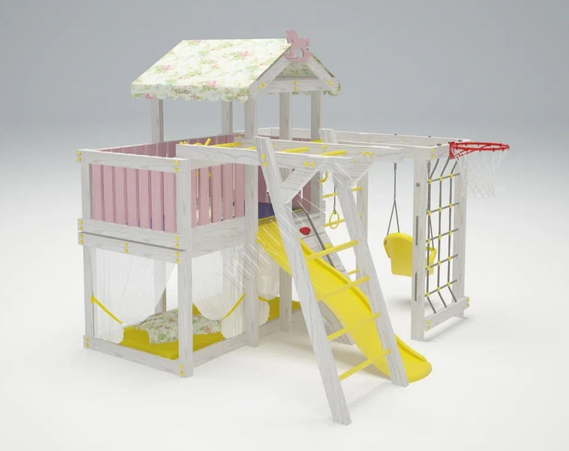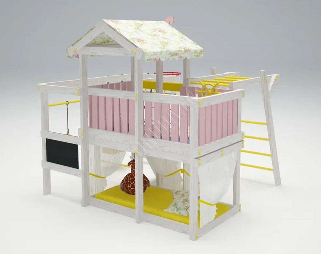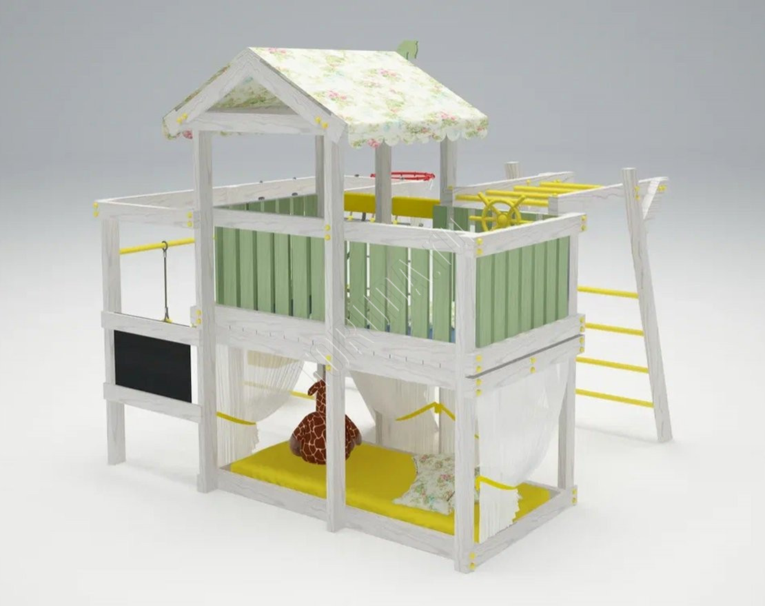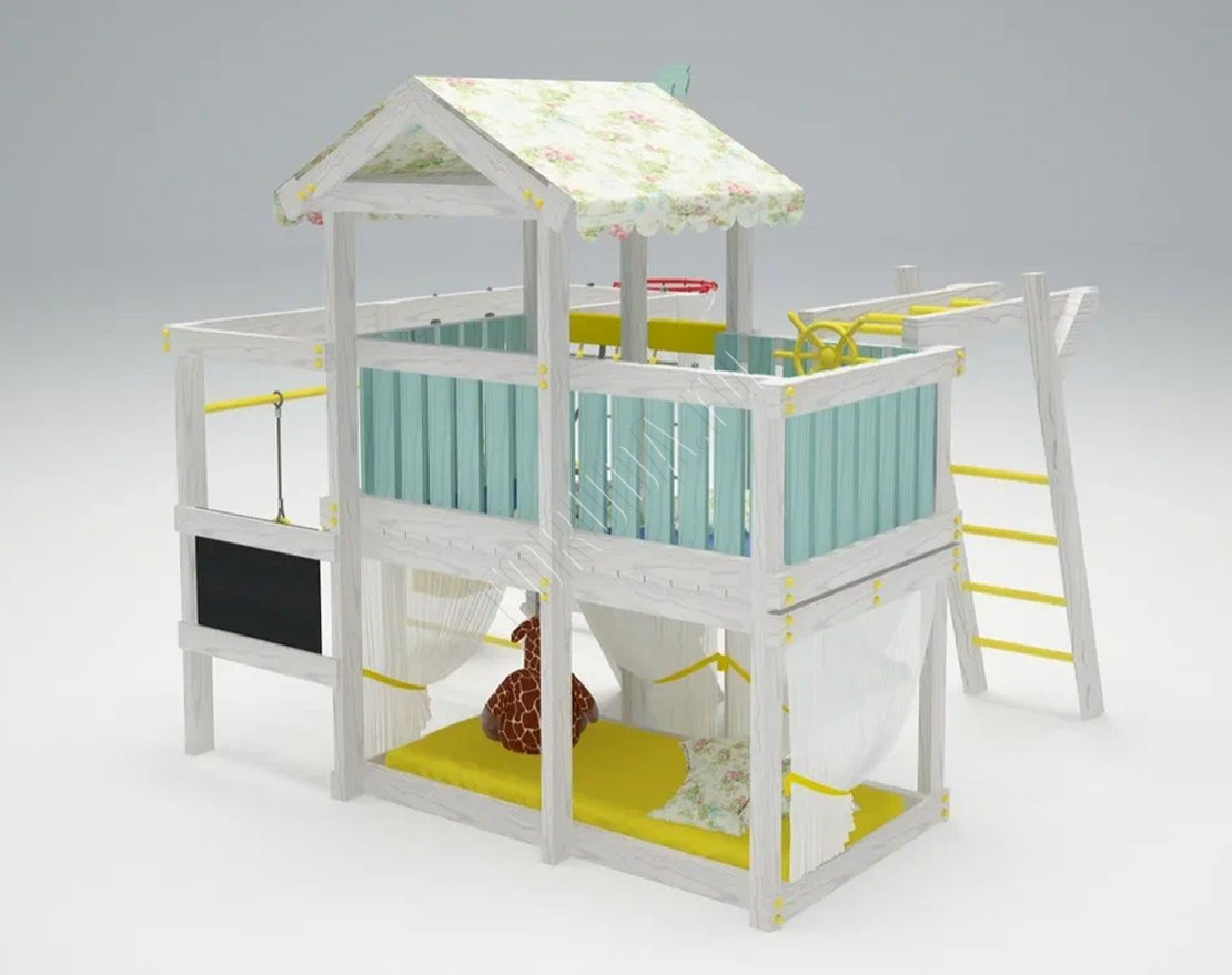 Каркас игрового комплекса изготовлен из натурального материала – массива сосны сечением 45мм х 90 мм. Всё оборудование бельгийского производства. Оно очень удобное, комфортное и безопасное для малышей.