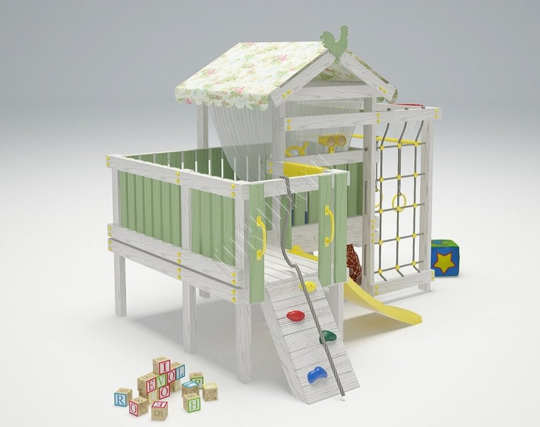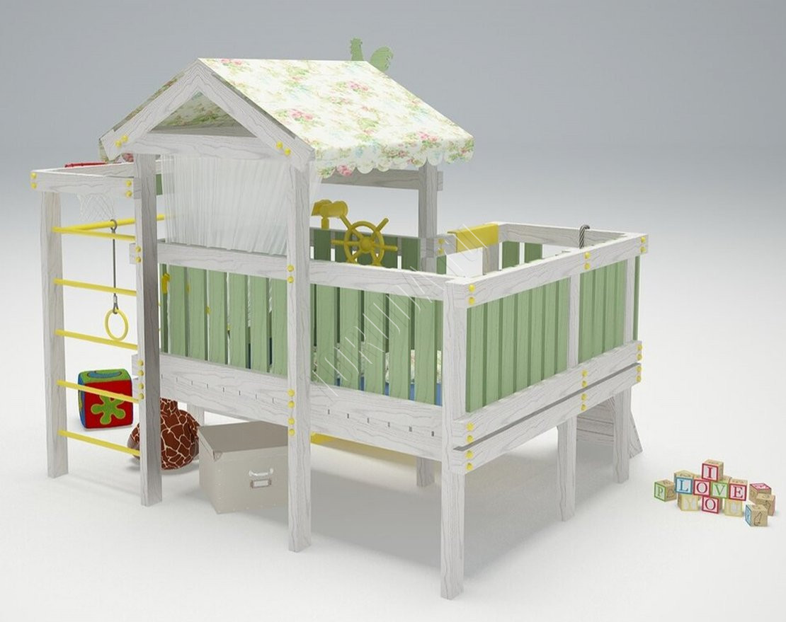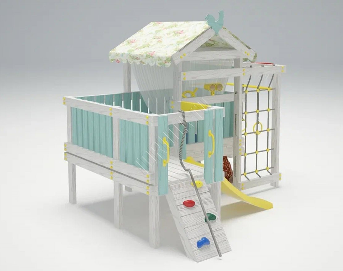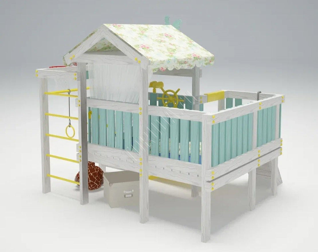 Расстояние от неё до пола - 60 сантиметров. Вход в неё начинается с мини-скалодрома с канатом и ведёт на расширенный балкон, на котором есть штурвал и бинокль. Заканчивается балкон домиком с крышей и мягким тюлем.
