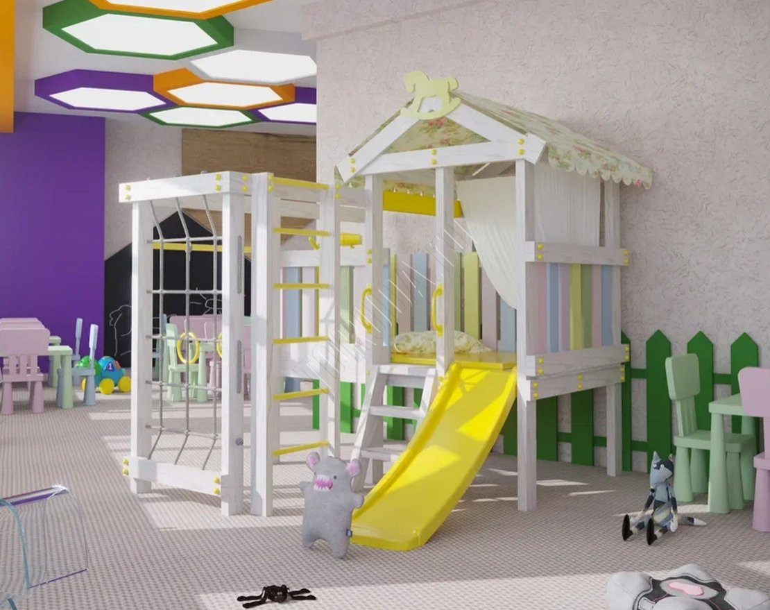 Игровой комплекс создан специально для самых маленьких. Конструкция разработана согласно ГОСТам, все элементы отшлифованы и покрыты сертифицированной безвредной краской, углы скруглены, болтовые соединения находятся под пластиковыми заглушками. Каркас дополнительно усилен, чтобы малыши могли играть и веселиться.