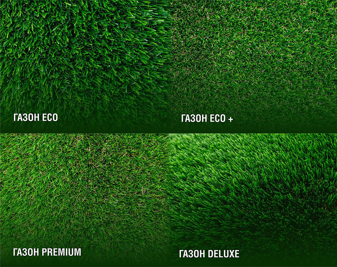 | Эстетические качества | Зеленый газон с зеленым подшерстком, широкий ассортимент цветовой палитры | Мягкий, пушистый, с коричневым подшерстком (имитация подсушенной травы), длина нити 45 мм, направление ворса — вверх | Идеальный баланс толщины ворса, его ребра жесткости, мягкости и стойкости (не имеет направления ворса) |