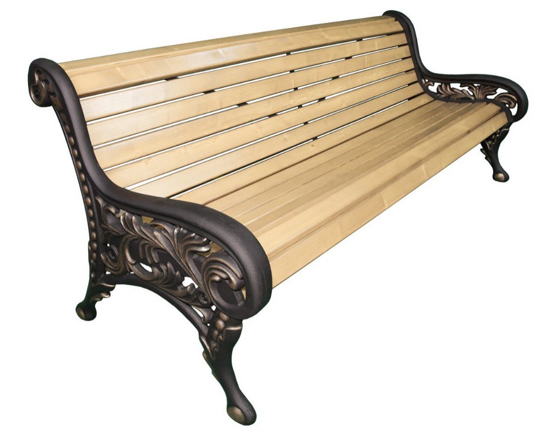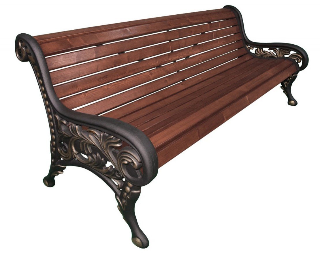 Парковая скамейка с подлокотниками и высокой спинкой выполнена в классическом стиле. Основой конструкции служат массивные боковины из чугунного художественного литья. Они покрыты порошковой полимерной краской черного цвета с бронзовой патиной, что защищает их от атмосферных осадков и выгорания на солнце. Деревянные элементы защищены современными лакокрасочными материалами, что продлевает срок службы изделия.
